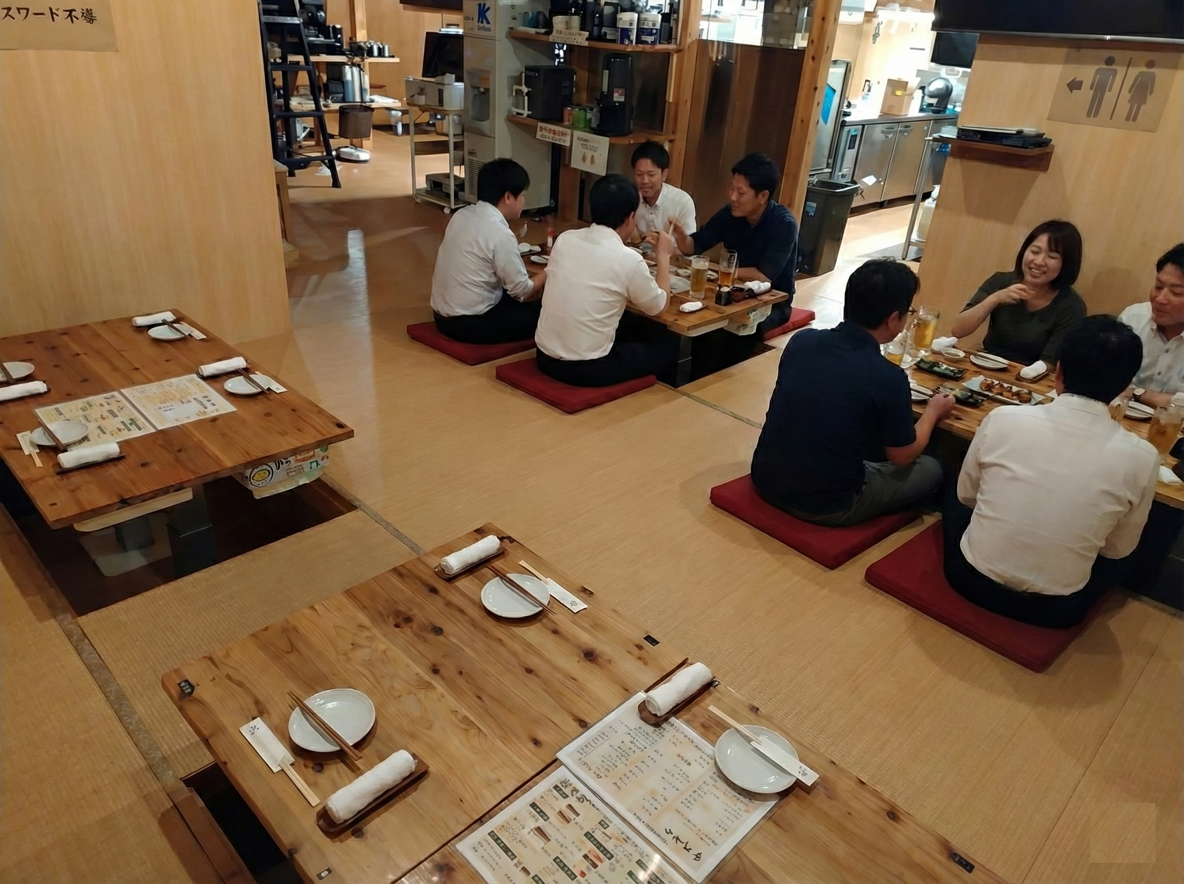 日本人なら、やはり靴を脱ぐのが一番落ち着きます。 入り口で靴を脱いで、どこか懐かしい時間へタイムスリップしていただきたい。 全席掘りごたつで、どの世代の方も足を伸ばしてくつろげる作りにしました。 また、テーブルは区切りなく繋げられる配置にしています。大人数でも一つの輪になり、顔を見合わせて語り合える環境を大切にしています。